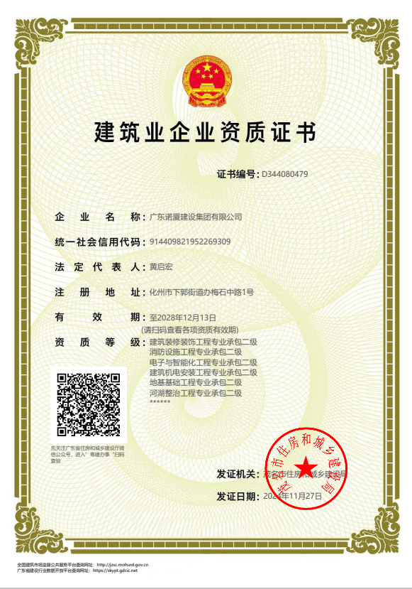 廣東諾廈建設(shè)集團(tuán)有限公司是諾廈集團(tuán)的核心企業(yè),具備國家房屋建筑工程施工總承包壹級、市政工程施工總承包壹級、港口與航道工程總承包、建筑裝修裝飾工程、消防設(shè)施工程、地基基礎(chǔ)工程、機(jī)電設(shè)備安裝工程、體育場地設(shè)施工程、建筑智能化工程、河湖整治工程、水利水電工程等資質(zhì)。......
